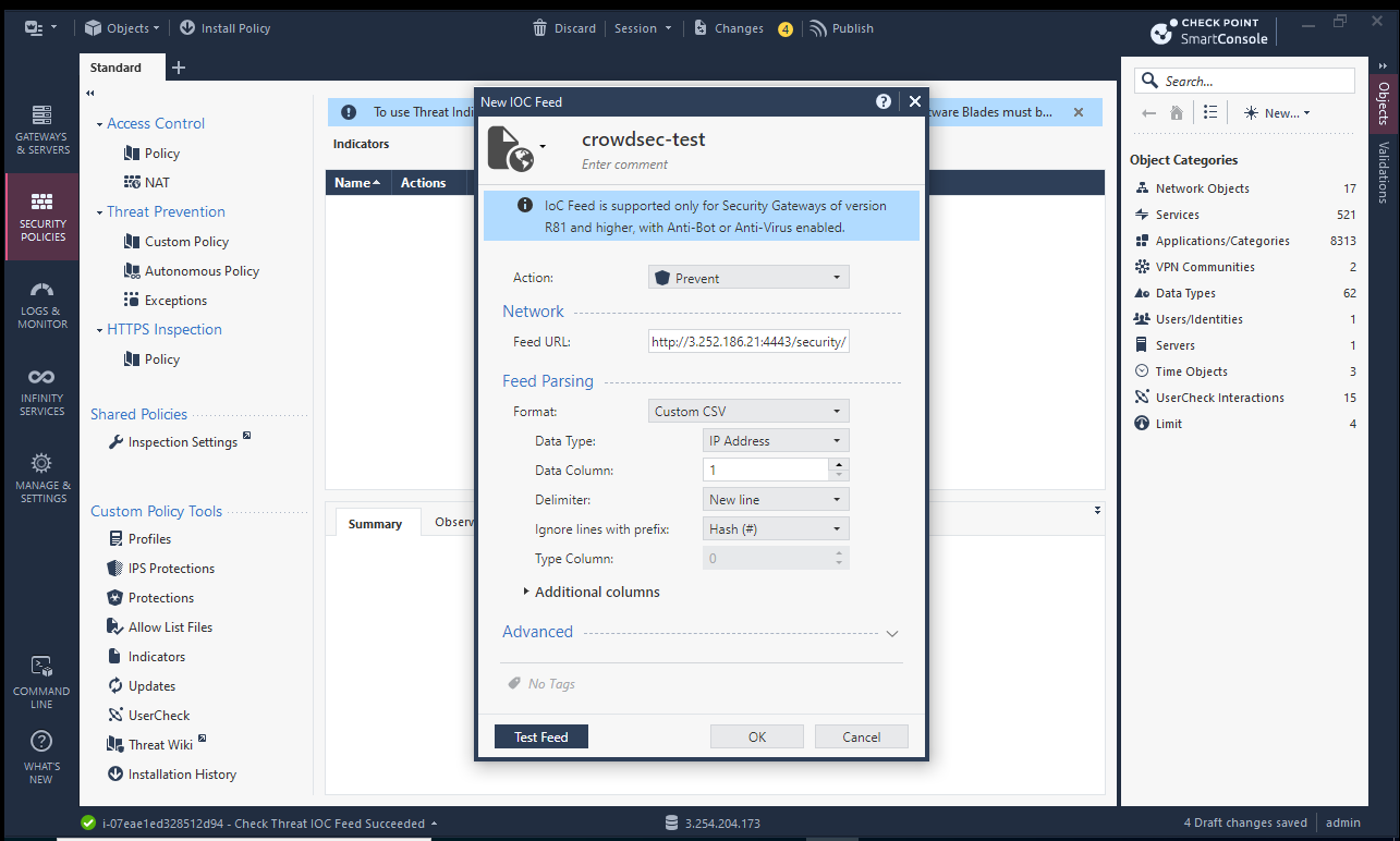 The CrowdSec Checkpoint integration allows you to block malicious IPs in your Checkpoint firewall. This guide will walk you through the steps to integrate CrowdSec blocklists with your Checkpoint firewall.